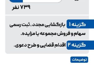 بر اساس این گزارش، از مجموع آرای ثبتشده، حدود ۸۴ درصد سهامداران گزینه بازگشایی مجدد، ثبت رسمی سهام و فروش مجموعه یا مزایده را انتخاب کردهاند و در مقابل ۱۶ درصد گزینه اقدام قضایی و طرح دعوی را برگزیدهاند.