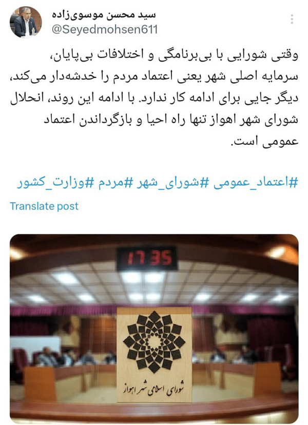 «وقتی شورایی با بیبرنامگی و اختلافات بیپایان، سرمایه اصلی شهر یعنی اعتماد مردم را خدشهدار میکند، دیگر جایی برای ادامه کار ندارد. با ادامه این روند، انحلال شورای شهر اهواز تنها راه احیا و بازگرداندن اعتماد عمومی است.»