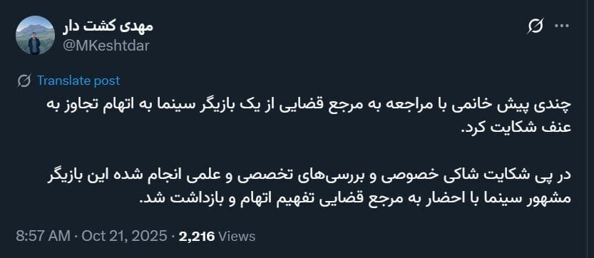 مهدی کشت دار مدیرعامل رسانه قوه قضاییه میزان در شبکه اجتماعی ایکس نوشت: چندی پیش خانمی با مراجعه به مرجع قضایی از یک بازیگر سینما به اتهام تجاوز به عنف شکایت کرد.